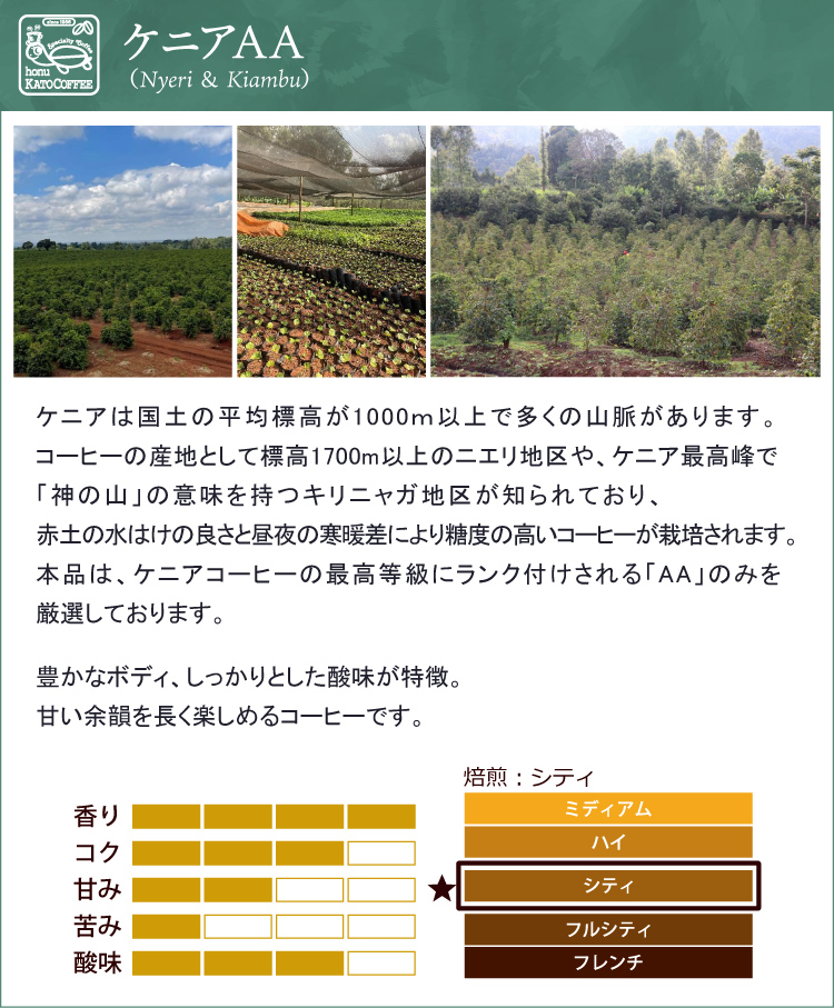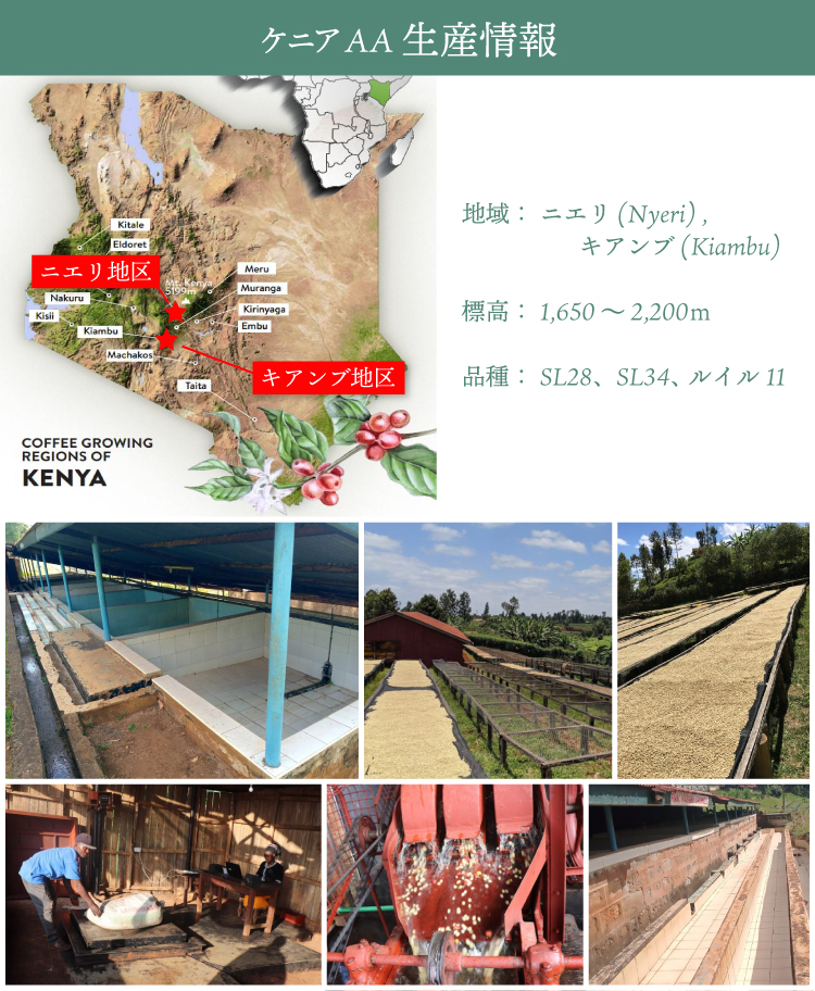 ケニアは国土の平均標高が1000m以上で多くの山脈があります。コーヒーの産地として標高1700m以上のニエリ地区や、ケニア最高峰で「神の山」の意味を持つキリニャガ地区が知られており、赤土の水はけの良さと昼夜の寒暖差により糖度の高いコーヒーが栽培されます。本品はケニア産コーヒーの最高等級グレード「AA」規格です。