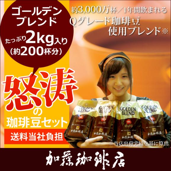 【赤字覚悟!】コーヒー鑑定士が認めたQグレードスペシャルティ珈琲豆を30%以上使用した、口当たりマイルド、コクと甘みと酸味が調和した味わい。ゴールデンブレンド・たっぷり2kg入り。 1番人気だからこそ、お努め価格でご奉仕いたします。しかも送料無料(一部地域を除く)でお届け致します。えっ!。。。そこまで!絶対お見逃し無く♪