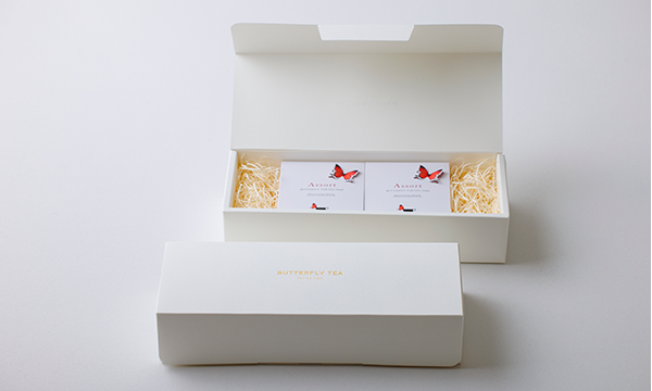 CUPやMUGのふちにかけて楽しむ紅茶「バタフライティー」を2箱詰め合わせにしたギフトボックス。