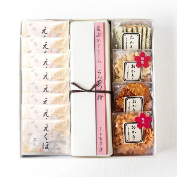 らんとう桜1本にさくらおかき2個(海老1個、桜葉1個)、おぼろおかき1個、里おかき1個、みるく饅頭えくぼ8個を詰合せました。