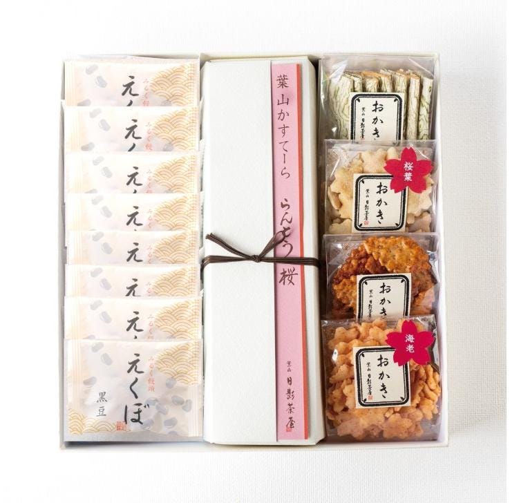 - らんとう桜1本 みるく饅頭えくぼ8個 さくらおかき2個(海老、桜葉 ×各1) おぼろおかき1個 里おかき1個
