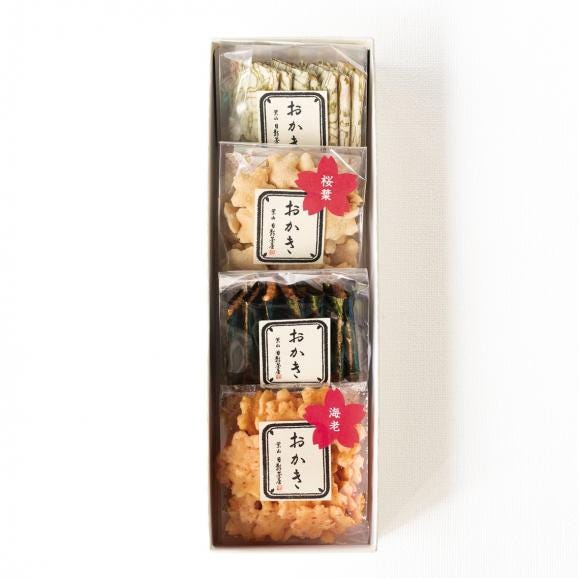 桜咲く春の合格祝い、就職祝いなどの新たな門出の贈り物に最適です。 春限定のおかき2種と人気おかき2種の色鮮やかなおかき詰合せです。