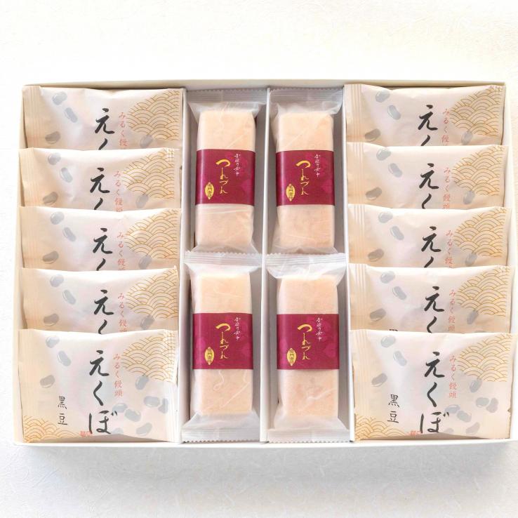 - 【内容量】 14個入:みるく饅頭えくぼ×10個、手造り最中つれづれ芋餡×4個