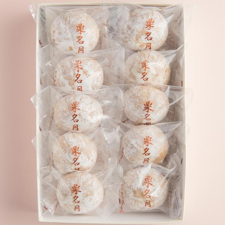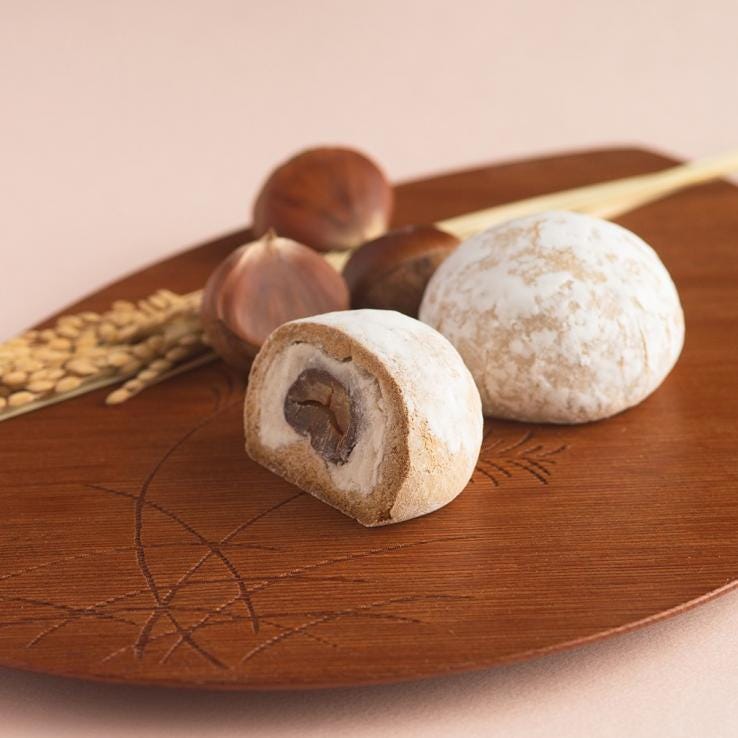 丸ごと渋皮栗を白餡で包み、さらに焦ばしい麦焦がし粉で包み、焼成した焼菓子です。