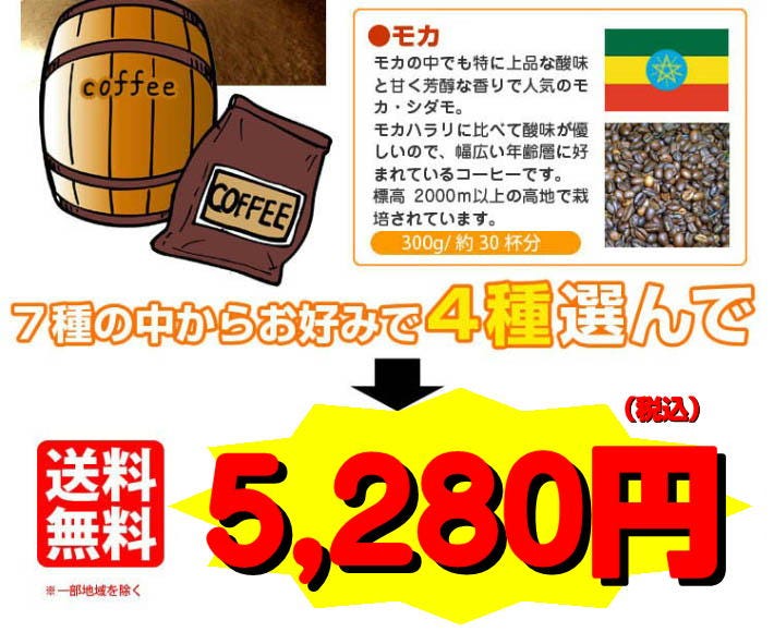 エチオピア「モカ・シダモ」は、標高2000m以上の高地で栽培されています。 モカの中でも特に上品な酸味と甘く芳醇な香りで人気のモカ・シダモ。モカハラリに比べて酸味が優しいので、幅広い年齢層に好まれているコーヒーです。 様々なコーヒーブレンドに選ばれているモカ・シダモは、ブレンドすることによって、酸味と甘い香りがプラスされ、よりコーヒーを楽しむ方に喜ばれています。[300g/約30杯分] |