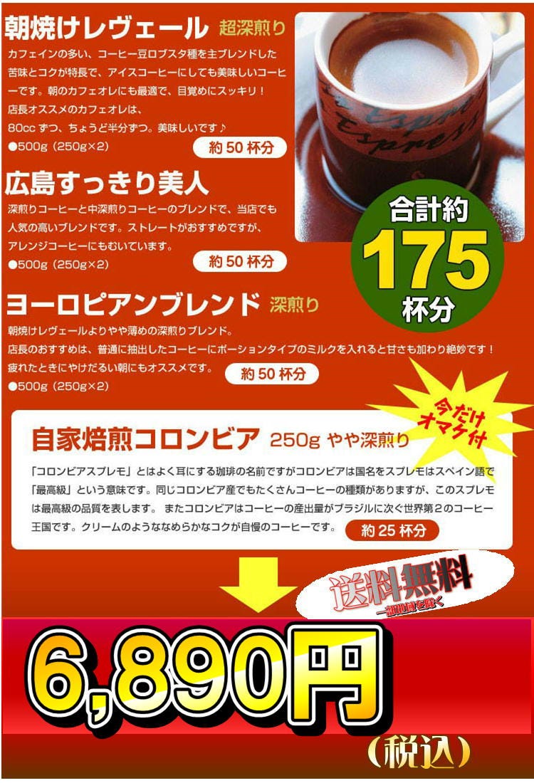 | カフェオレに最適!ブラウンゴールドセット カフェオレに最適の深煎りコーヒーを選んだものです。 苦味が強く濃い目のコーヒーが好きな方に、またカフェオレにはこの苦味とコクがミルクにマッチして両方の味が活かされるコーヒーです。 ● ヨーロピアンブレンド(深煎り)…500g (250g×2) ● 朝焼けレヴェール(超深煎り)…500g (250g×2) ● 広島すっきり美人(やや深煎り)…500g (250g×2) ● コロンビア(深煎り)…250g |