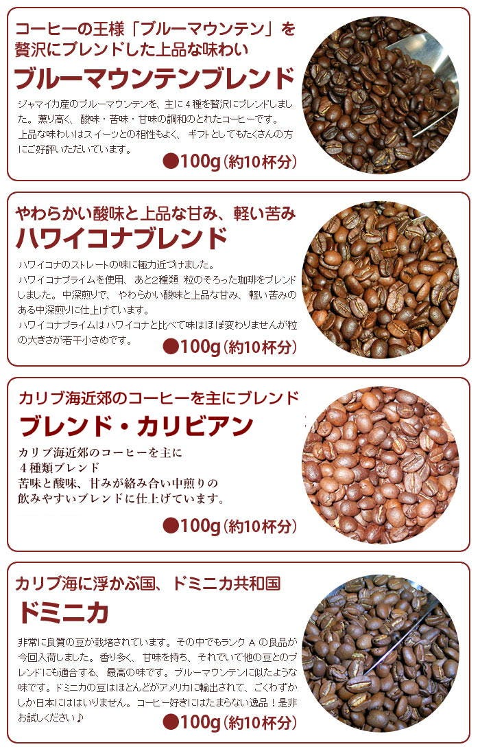 ・ブルーマウンテンブレンド×100g ・ブレンド「カリビアン」×100g ・トラジャカロシ×100g ・ドミニカ×100g ・コスタリカ×100g ・ハワイコナブレンド×100g ・メキシコ×100g 合計8種の薫り高いコーヒーをご用意しました♪ |