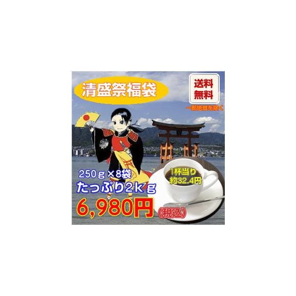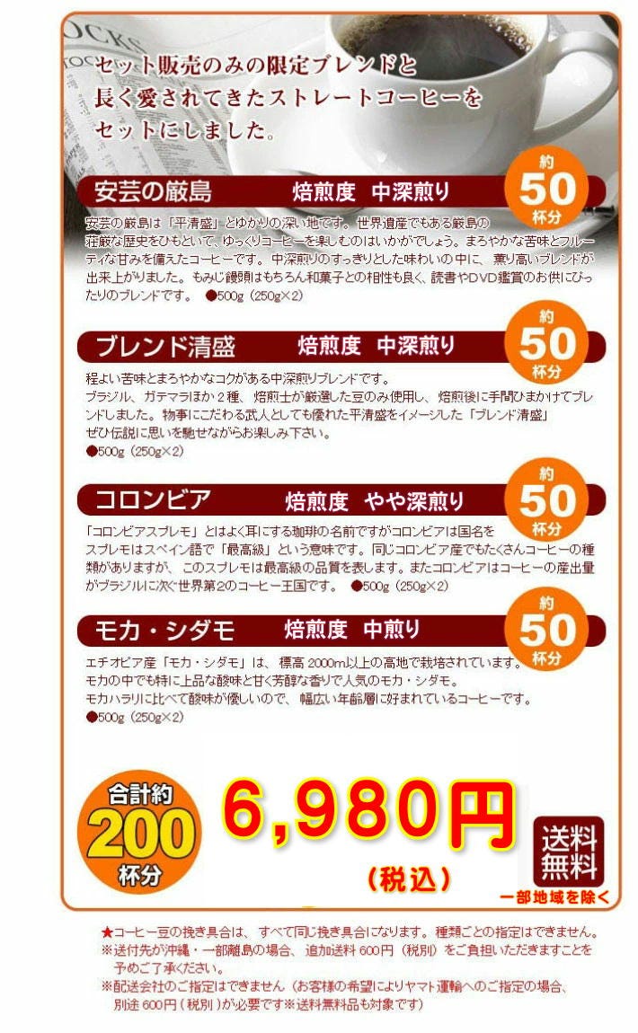 | ・ブレンド清盛×500g(250g×2) ・安芸の厳島×500g(250g×2) ・モカ・シダモ×500g(250g×2) ・コロンビア×500g(250g×2) 合計たっぷり2kg! | ||