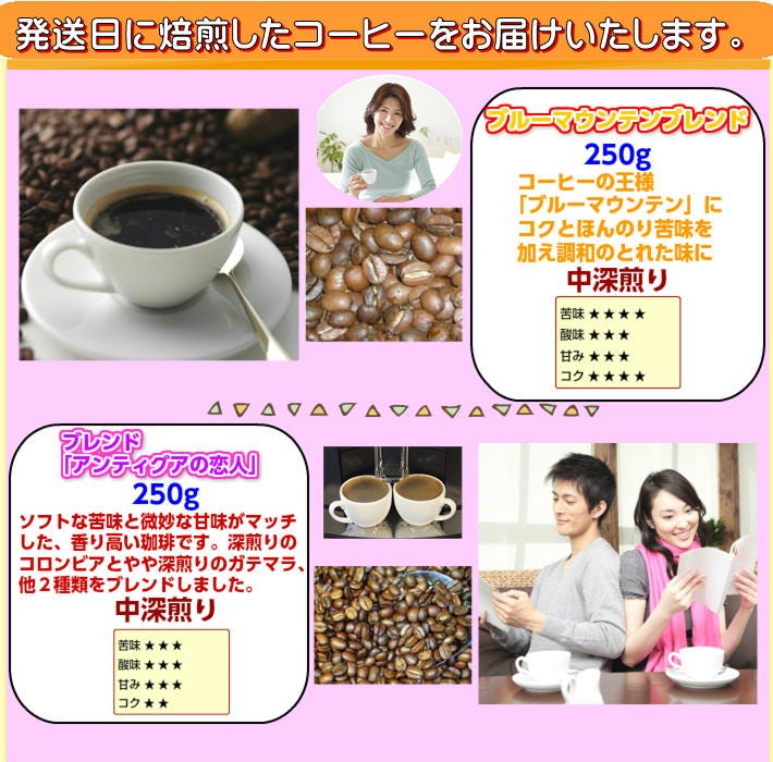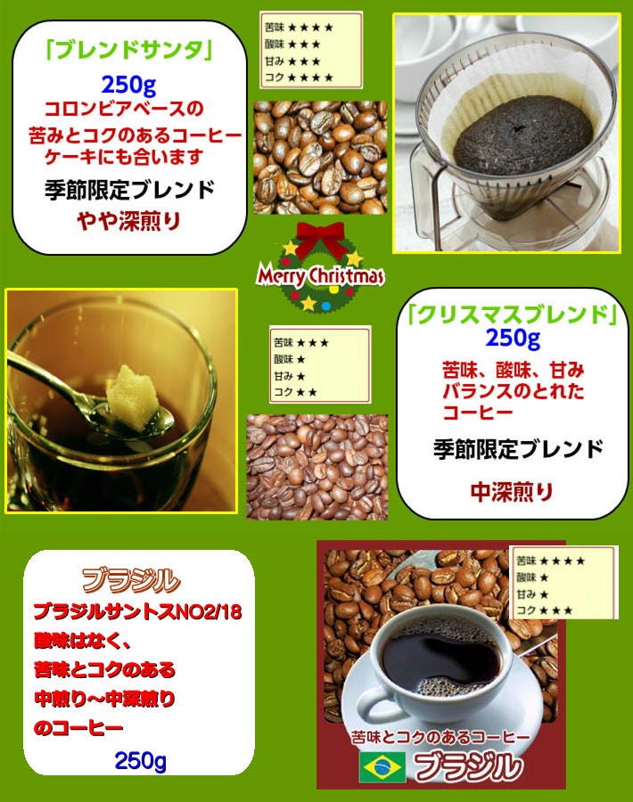 | ■ブラジル×250g(約25杯分) ■コロンビア×250g(約25杯分) ■モカ×250g(約25杯分) ■ホンジュラス×250g(約25杯分) ■ブレンド「アンティグアの恋人」×250g(約25杯分) ■クリスマスブレンド×250g(約25杯分) ■ブルーマウンテンブレンド×250g(約25杯分) ■ブレンド「サンタ」×250g(約25杯分) |
