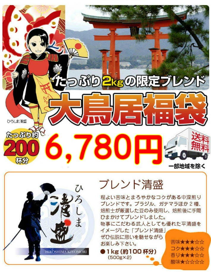 ■ブレンド「清盛」×1kg(500g×2)約100杯分 ■安芸の厳島×1kg(500g×2)約100杯分 合計たっぷり2,000g! |