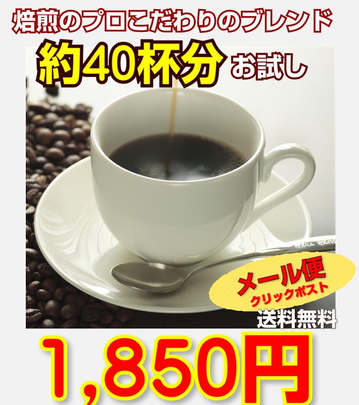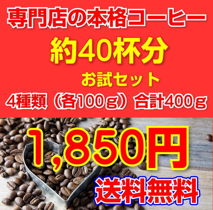●ロイヤルブレンド×100g(約10杯分) ●ブレンド絵下山×100g(約10杯分) ●モーニングブレンド×100g(約10杯分) ●ブレンド厳島×100g(約10杯分) 合計たっぷり400g(約40杯分)! |