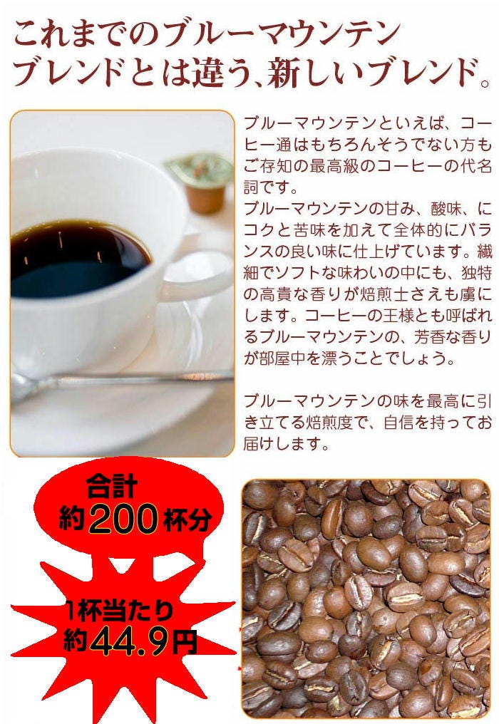 | ブルーマウンテンの甘み、酸味、にコクと苦味を加えて全体的にバランスの良い味に仕上げています。コーヒーの王様とも呼ばれるブルーマウンテンの、芳香な香りが部屋中を漂うことでしょう。 これまでのブルーマウンテンブレンドとはまた違う、新しいブレンドです。この機会にぜひお試し下さい。 |