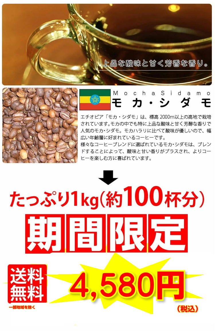 エチオピア「モカ・シダモ」は、標高2000m以上の高地で栽培されています。 モカの中でも特に上品な酸味と甘く芳醇な香りで人気のモカ・シダモ。モカハラリに比べて酸味が優しいので、幅広い年齢層に好まれているコーヒーです。 様々なコーヒーブレンドに選ばれているモカ・シダモは、ブレンドすることによって、酸味と甘い香りがプラスされ、よりコーヒーを楽しむ方に喜ばれています。 ■モカ・シダモ×1kg(500g×2)約100杯分 合計たっぷり1,000g(約100杯分)! |