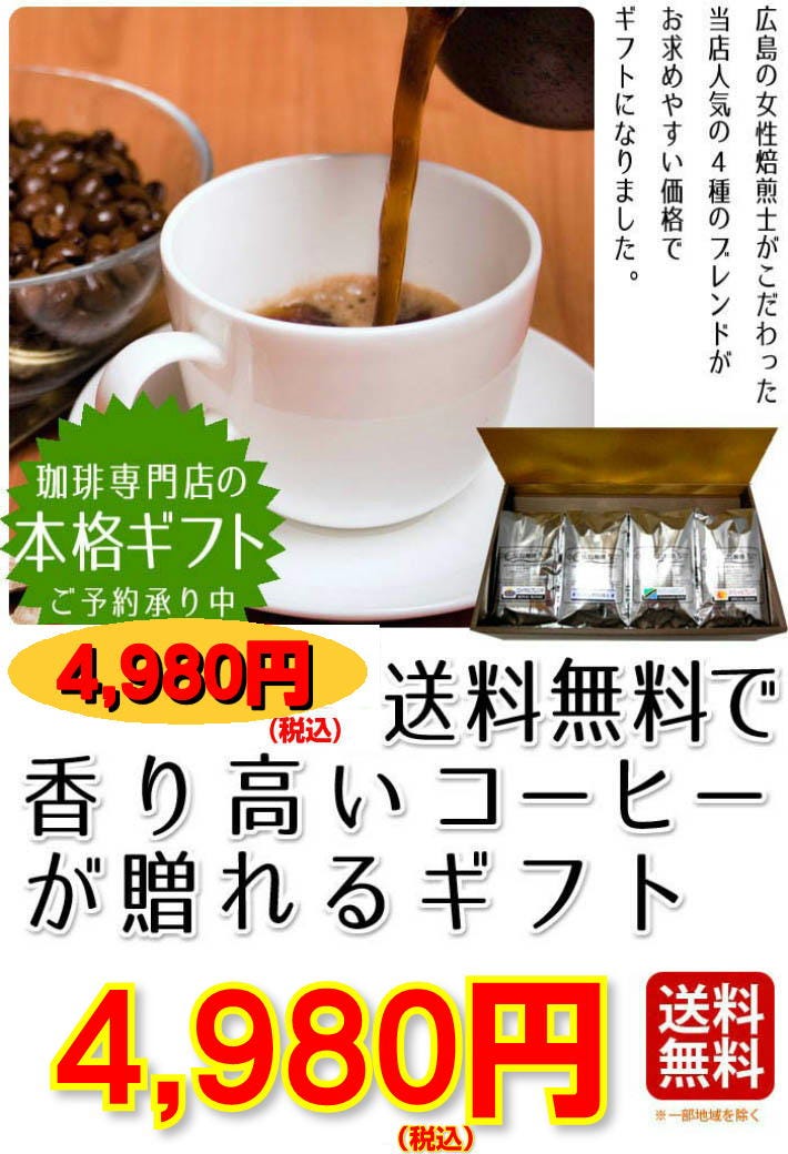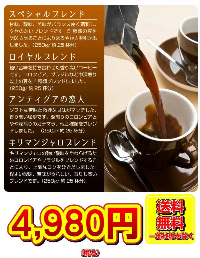 | ■スペシャルブレンド×250g(約25杯分) ■ロイヤルブレンド×250g(約25杯分) ■アンティグアの恋人×250g(約25杯分) ■キリマンジャロブレンド×250g(約25杯分) ※第三者受け取りの場合はトラブル防止のため、お支払いはクレジットカードまたは銀行振込前払いに限らせて頂きます。 |
