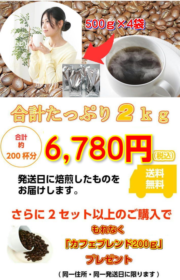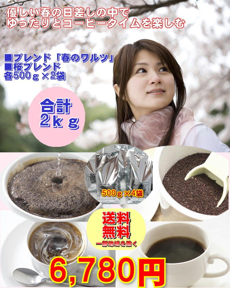 ■春のワルツ×1kg(500g×2/約100杯分) ■桜ブレンド×1kg(500g×2/約100杯分) 合計たっぷり2,000g(約200杯分)! |