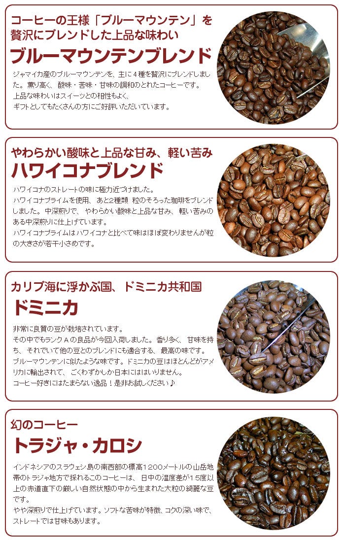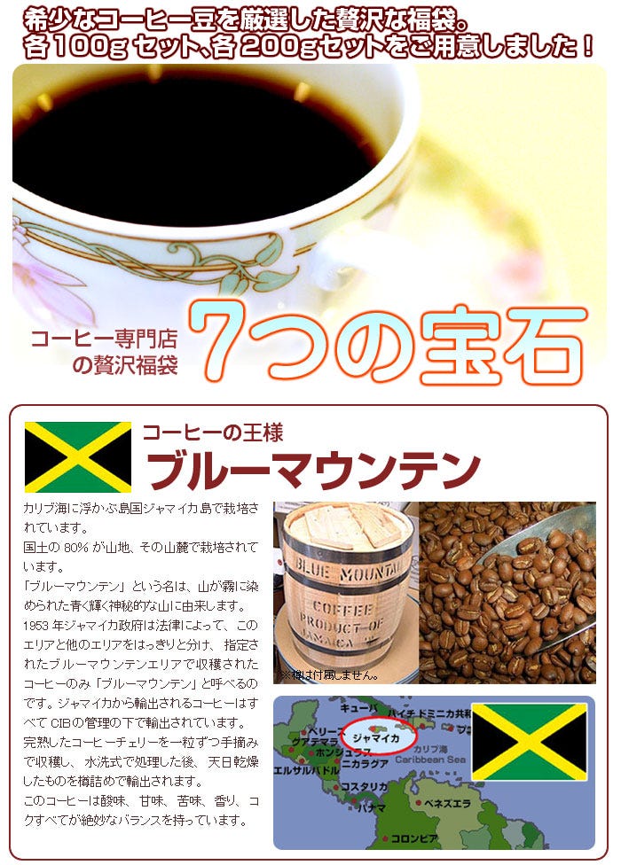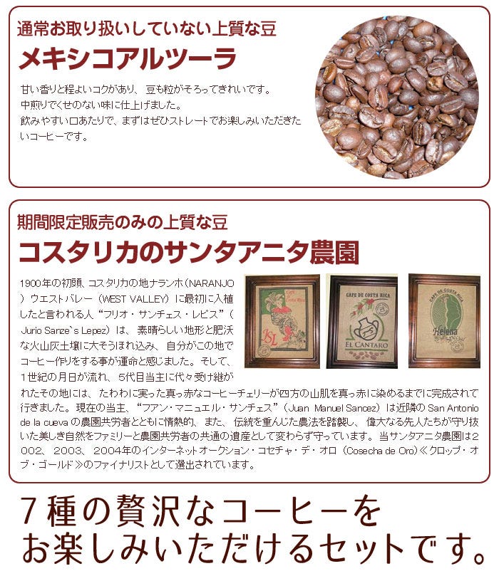 | ・ブルーマウンテン×100g ・ブルーマウンテンブレンド×100g ・トラジャカロシ×100g ・ドミニカ×100g ・コスタリカ×100g ・ハワイコナブレンド×100g ・メキシコ×100g 合計7種の薫り高いコーヒーをご用意しました♪ |