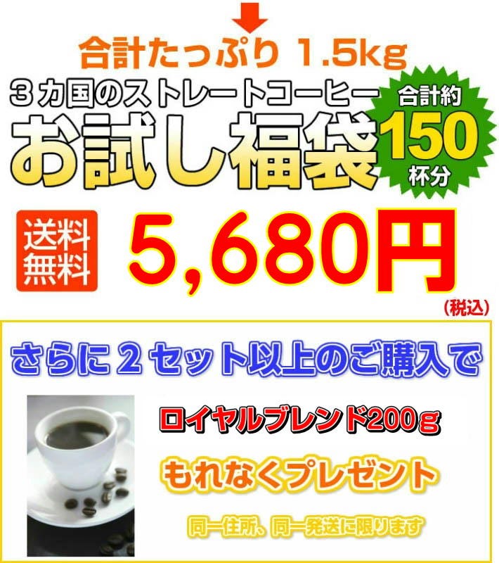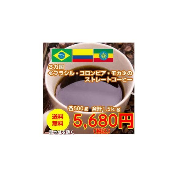 ■ブラジル×500g(約50杯分) ■コロンビア×500g(約50杯分) ■モカ×500g(約50杯分) 合計たっぷり1,500g(約150杯分)! 3カ国のストレートコーヒーを飲み比べできるお手頃価格のセット! |
