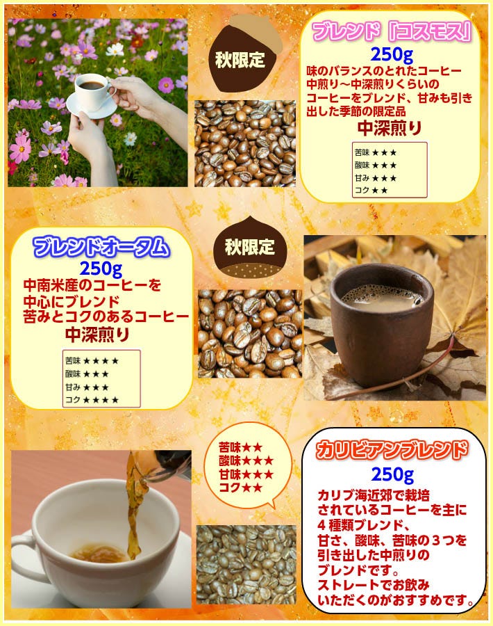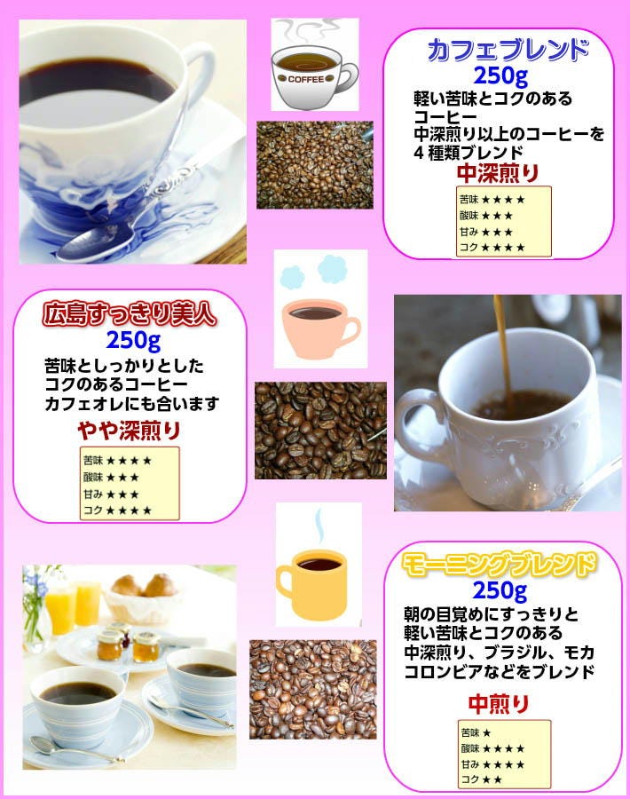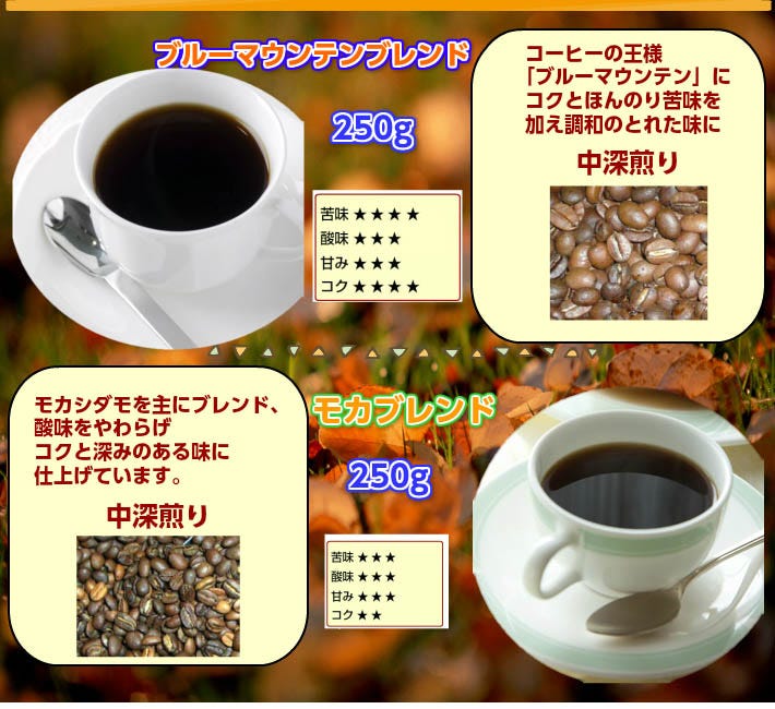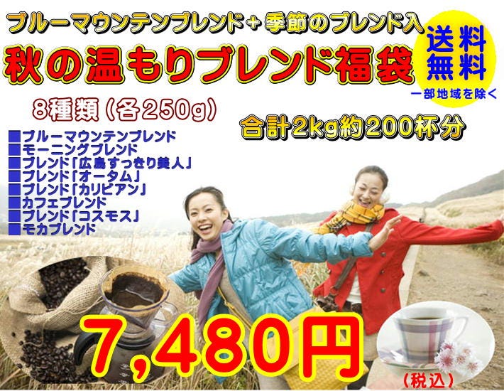 ■ブルーマウンテンブレンド×250g(約25杯分) ■モカブレンド×250g(約25杯分) ■ブレンド「広島すっきり美人」×250g(約25杯分) ■ブレンド「オータム」×250g(約25杯分) ■ブレンド「カリビアン」×250g(約25杯分) ■ブレンド「コスモス」×250g(約25杯分) ■カフェブレンド×250g(約25杯分) ■モーニングブレンド×250g(約25杯分) 合計たっぷり2,000g(約200杯分)! |