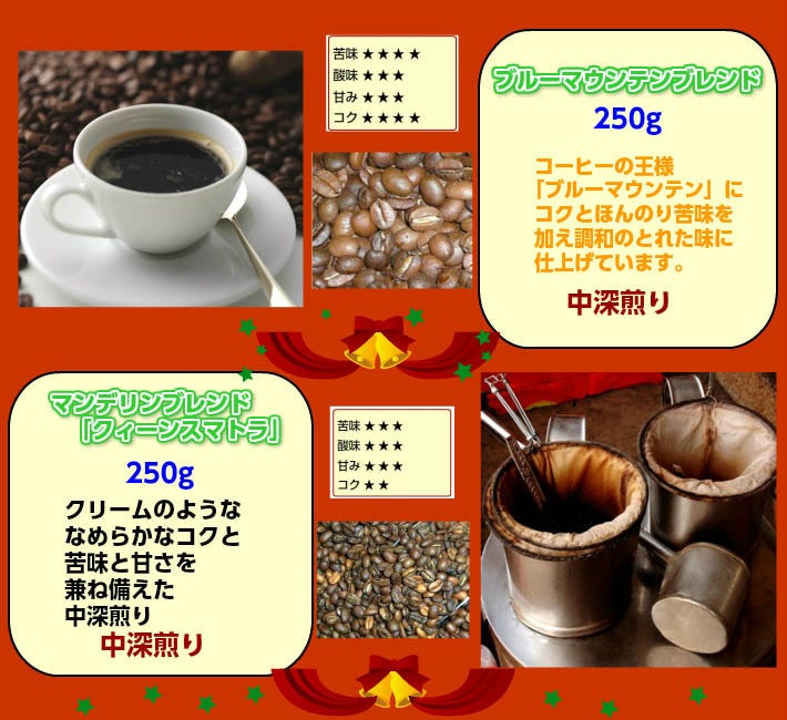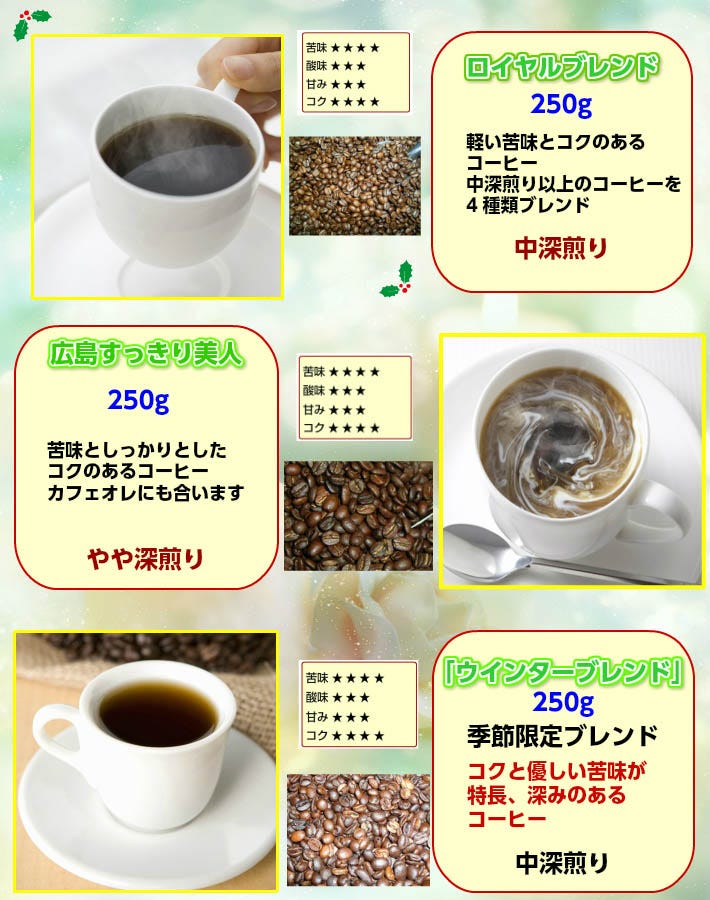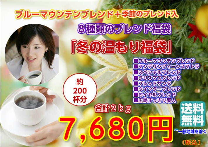 ■ブルーマウンテンブレンド×250g(約25杯分) ■ブレンド「クィーンスマトラ」×250g(約25杯分) ■ブレンド「広島すっきり美人」×250g(約25杯分) ■ブレンド「サンタ」×250g(約25杯分) ■スペシャルブレンド×250g(約25杯分) ■クリスマスブレンド×250g(約25杯分) ■ロイヤルブレンド×250g(約25杯分) ■ウインターブレンド×250g(約25杯分) 合計たっぷり2,000g(約200杯分)! |