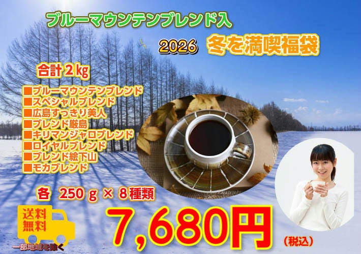 ■ブルーマウンテンブレンド×250g(約25杯分) ■モカブレンド×250g(約25杯分) ■ブレンド「広島すっきり美人」×250g(約25杯分) ■ブレンド「厳島」×250g(約25杯分) ■スペシャルブレンド×250g(約25杯分) ■ブレンド「絵下山」×250g(約25杯分) ■ロイヤルブレンド×250g(約25杯分) ■キリマンジャロブレンド×250g(約25杯分) 合計たっぷり2,000g(約200杯分)! |