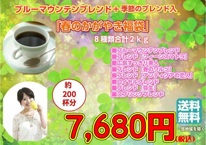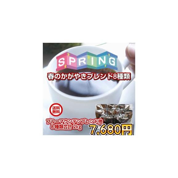 ■ブルーマウンテンブレンド×250g(約25杯分) ■ブレンド「クィーンスマトラ」×250g(約25杯分) ■ブレンド「広島すっきり美人」×250g(約25杯分) ■ブレンド「春のワルツ」×250g(約25杯分) ■スプリングブレンド×250g(約25杯分) ■ブレンド「弥生」×250g(約25杯分) ■ロイヤルブレンド×250g(約25杯分) ■ブレンド「アンティグアの恋人」×250g(約25杯分) 合計たっぷり2,000g(約200杯分)! |