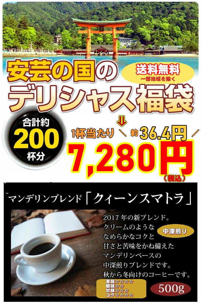 広島の女焙煎士こだわりのブレンドをたっぷり詰め込んだ大盛福袋!プロ仕様の本格コーヒーをご自宅でお楽しみください。 ■新ブレンド「クィーンスマトラ」×500g(約50杯分) ■ブルーマウンテンブレンド×500g(約50杯分) ■スペシャルブレンド×500g(約50杯分) ■ロイヤルブレンド×500g(約50杯分 合計たっぷり2,000g! |