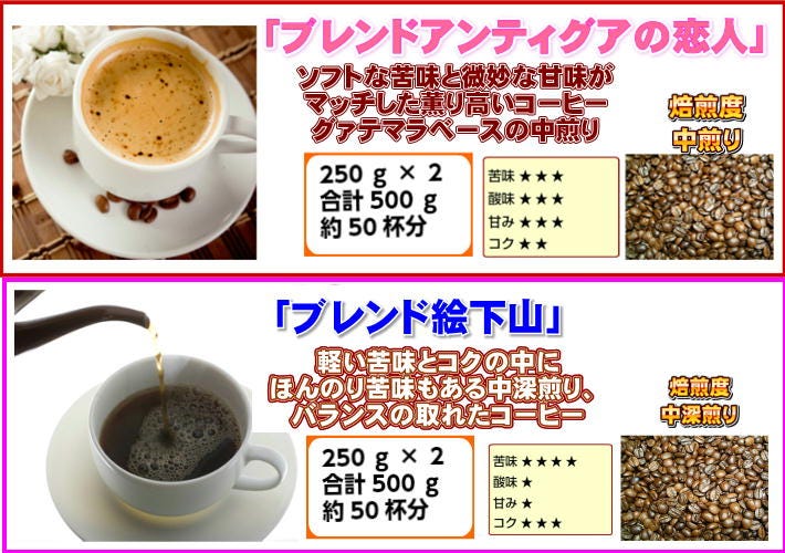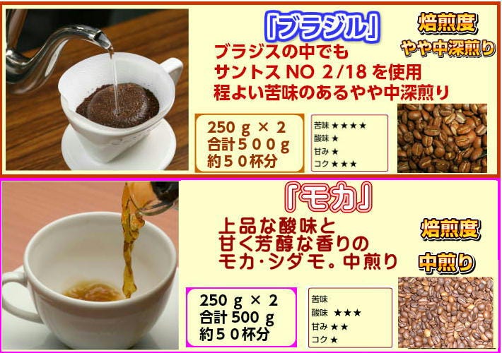 | 3 | ブラジル | 。(250g×2/合計500g/約50杯分)なブラジルはブレンドのベースになる豆です。酸味はほとんどなく、苦味とコクのあるコーヒーです。当店では中深煎りで仕上げています。 |