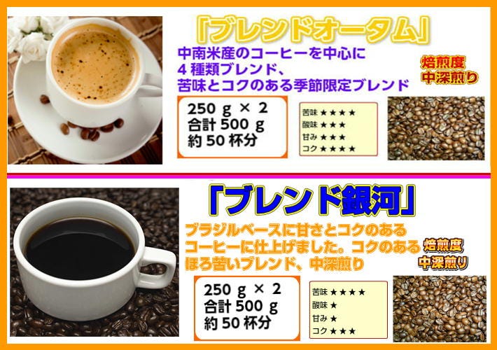 ブラジルベースに甘さとコクのあるコーヒーに仕上げています。軽い苦味と甘み、しっかりとしたコクを感じる中深煎り。 (250g×2/合計500g/約50杯分) |
