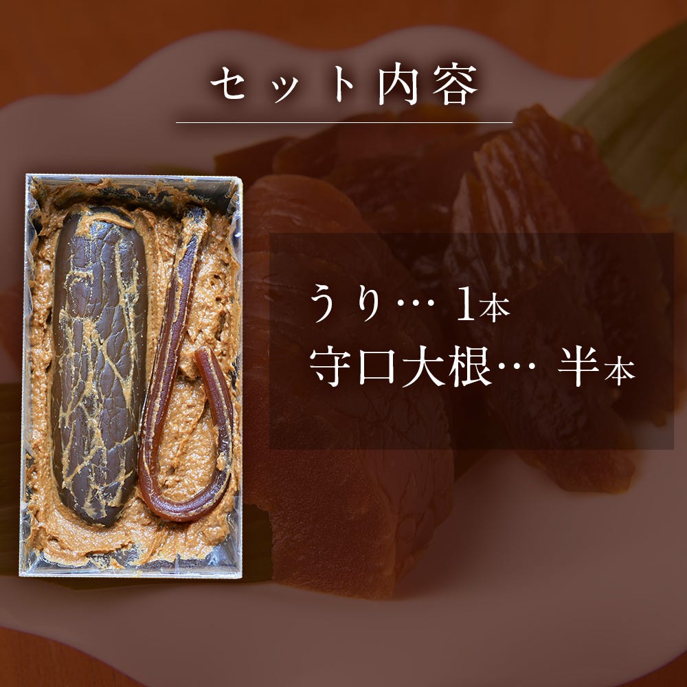原材料:うり(国産)、守口大根(国産)、漬け原材料 [酒かす、みりんかす、食塩、異性化液糖、酒精]/調味料(アミノ酸等)、甘味料( サッカリンNa、甘草)、保存料(ソルビン酸K)