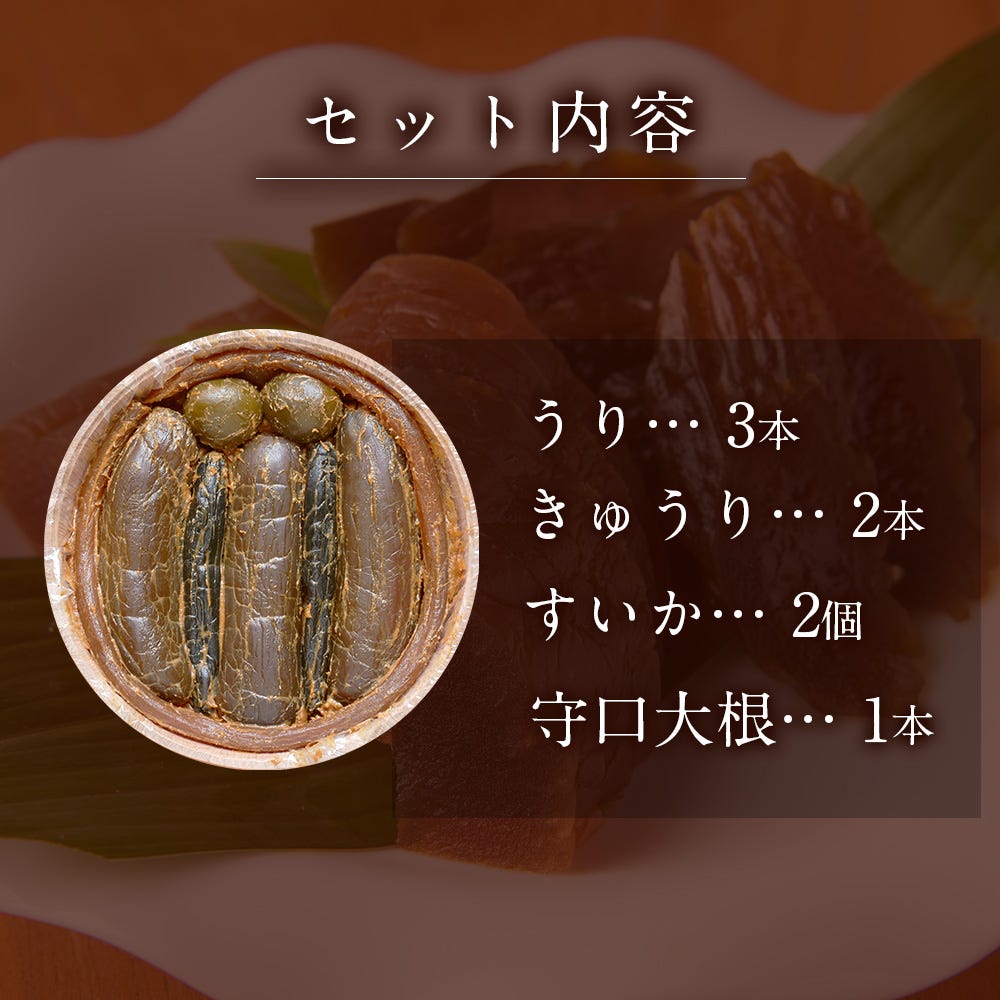 原材料:うり(国産)、きゅうり(国産)、すいか(インドネシア)、守口大根(国産)、漬け原材料 [酒かす、みりんかす、食塩、異性化液糖、酒精] / 調味料(アミノ酸等)、甘味料(サッカリンNa、甘草)、保存料(ソルビン酸K)