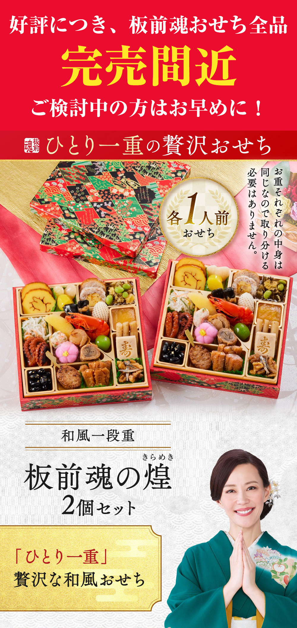 板前魂のおせち料理は、函館、小樽 、仙台、 築地 、山梨、金沢、浜松、 京都 、下関、 博多 、鹿児島など日本や海外の産地をまわり厳選した食材を使用し、有名店やホテルで修行したシェフや繁盛店を営む板長といった4人の匠が監修しています。