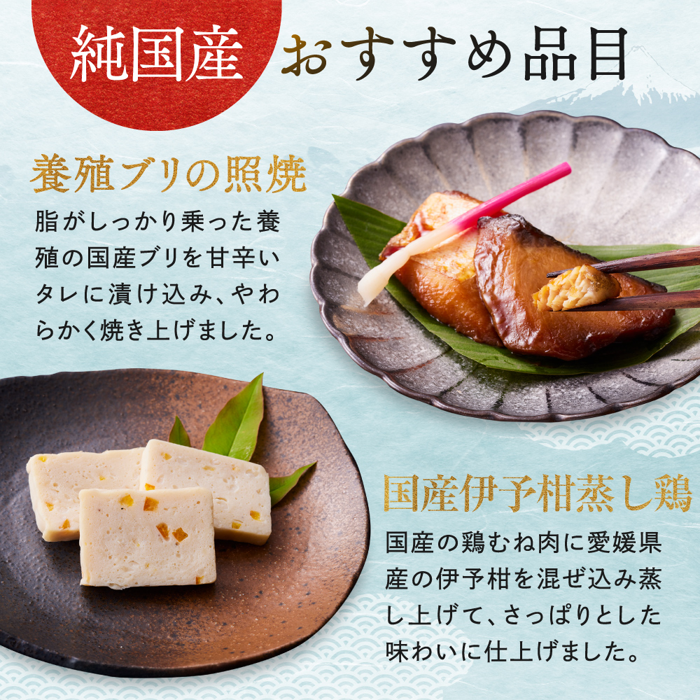 【一の重】真だこのやわらか煮/味付数の子(大)/若桃甘露煮/煮しめしいたけ/田作り/国産車海老の塩焼き/養殖ブリの照焼/さつまいも干支/きんかん/国産真ふぐの昆布和え/ピリ辛ホタルイカ