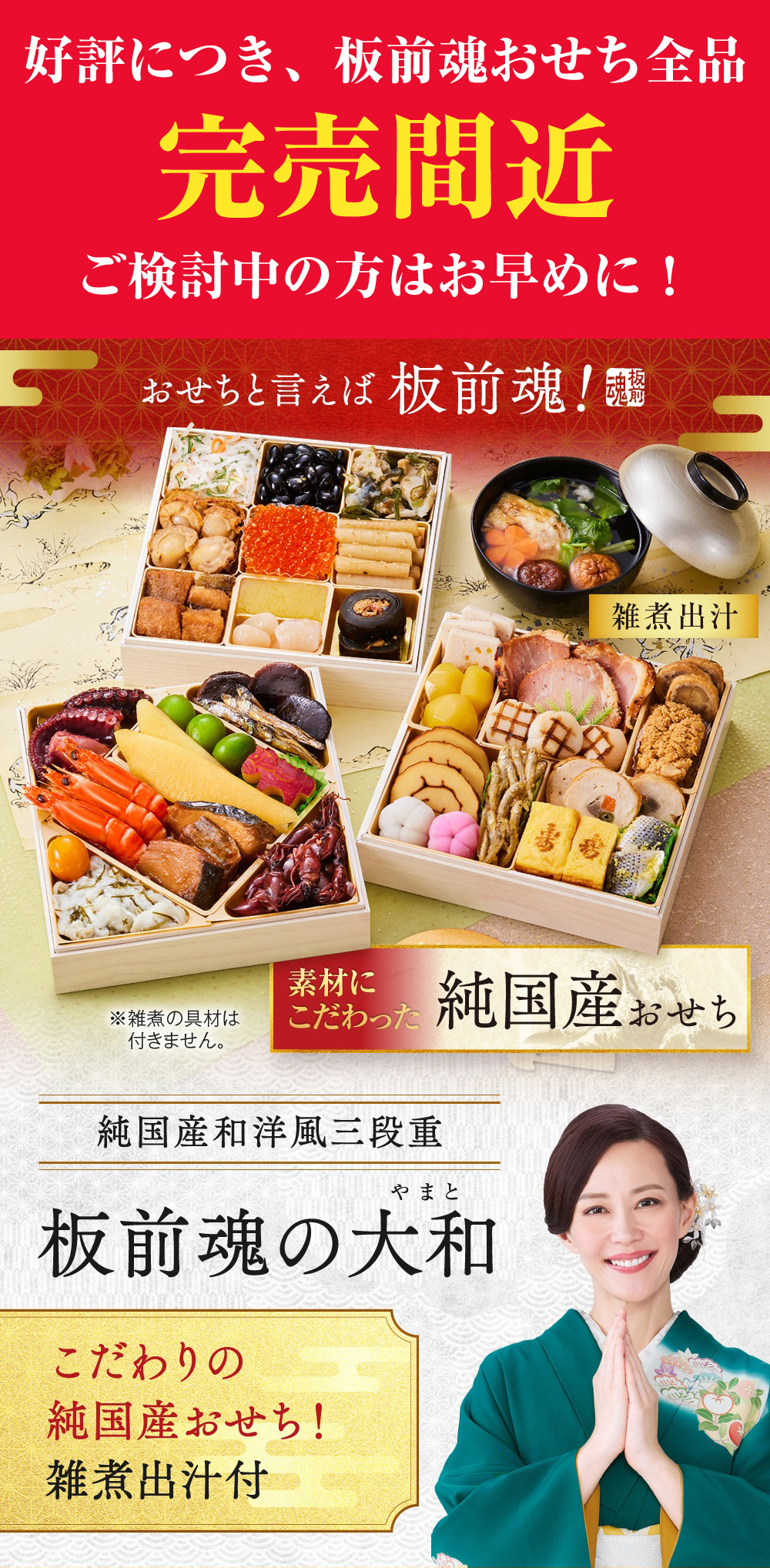 板前魂のおせち料理は、函館、小樽 、仙台、 築地 、山梨、金沢、浜松、 京都 、下関、 博多 、鹿児島など日本や海外の産地をまわり厳選した食材を使用し、有名店やホテルで修行したシェフや繁盛店を営む板長といった4人の匠が監修しています。