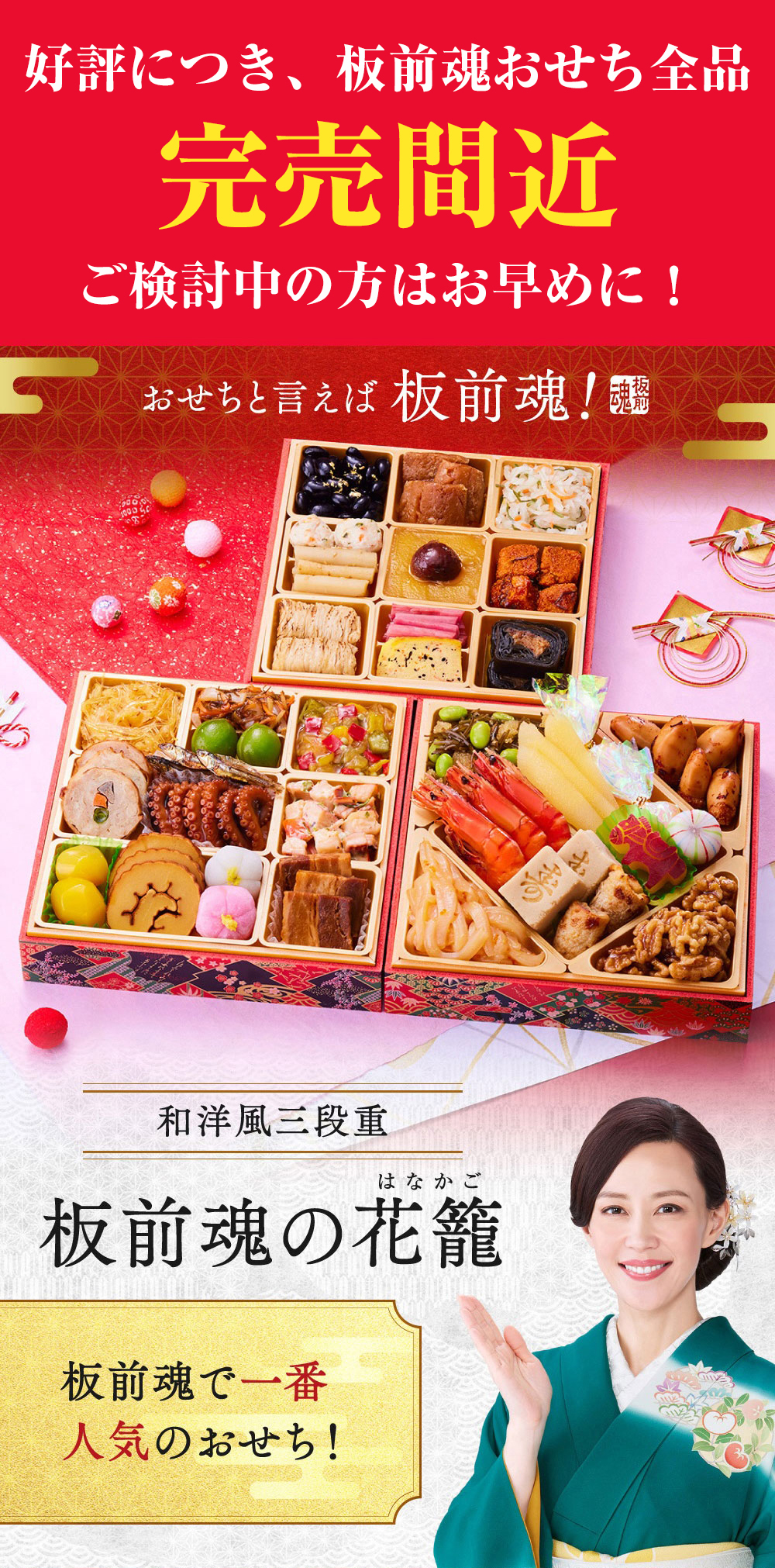 板前魂のおせち料理は、函館、小樽 、仙台、 築地 、山梨、金沢、浜松、 京都 、下関、 博多 、鹿児島など日本や海外の産地をまわり厳選した食材を使用し、有名店やホテルで修行したシェフや繁盛店を営む板長といった4人の匠が監修しています。