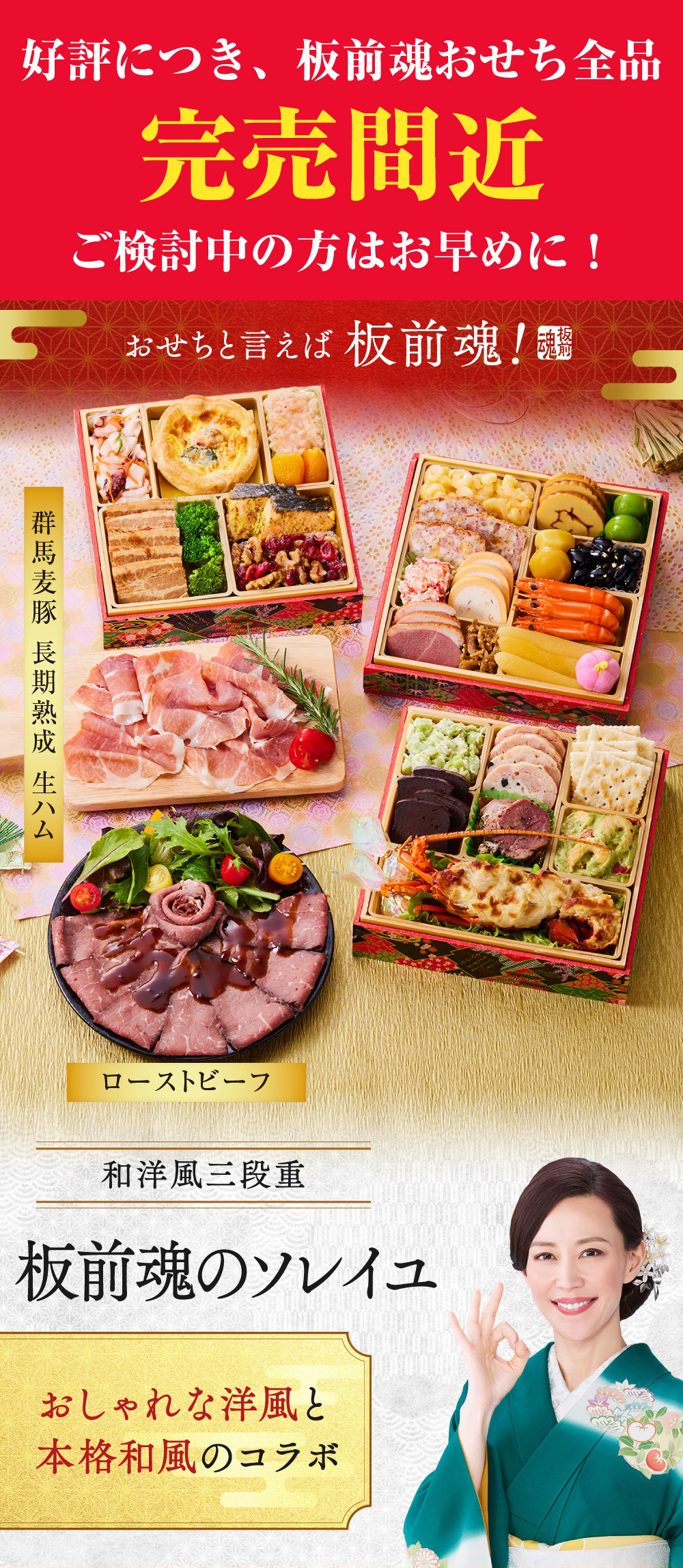 板前魂のおせち料理は、函館、小樽 、仙台、 築地 、山梨、金沢、浜松、 京都 、下関、 博多 、鹿児島など日本や海外の産地をまわり厳選した食材を使用し、有名店やホテルで修行したシェフや繁盛店を営む板長といった4人の匠が監修しています。
