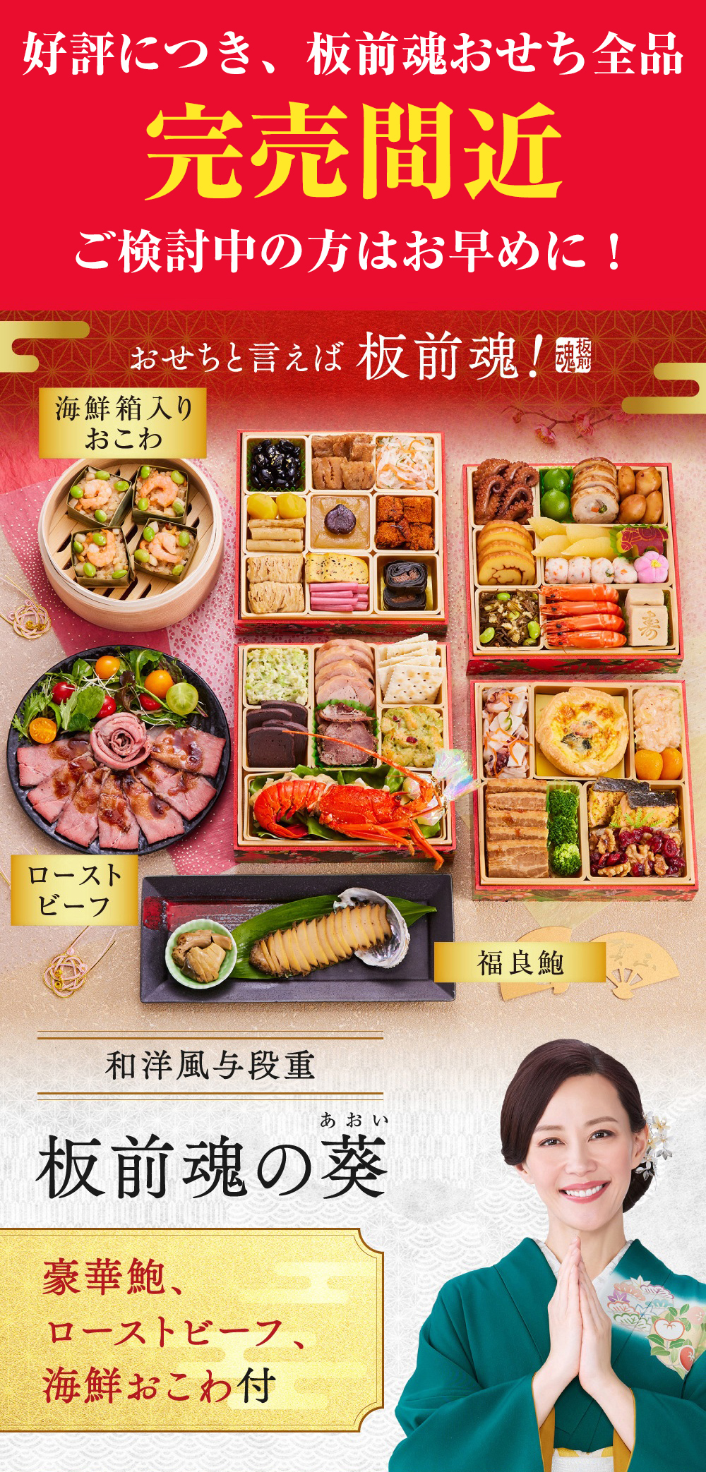 板前魂のおせち料理は、函館、小樽 、仙台、 築地 、山梨、金沢、浜松、 京都 、下関、 博多 、鹿児島など日本や海外の産地をまわり厳選した食材を使用し、有名店やホテルで修行したシェフや繁盛店を営む板長といった4人の匠が監修しています。