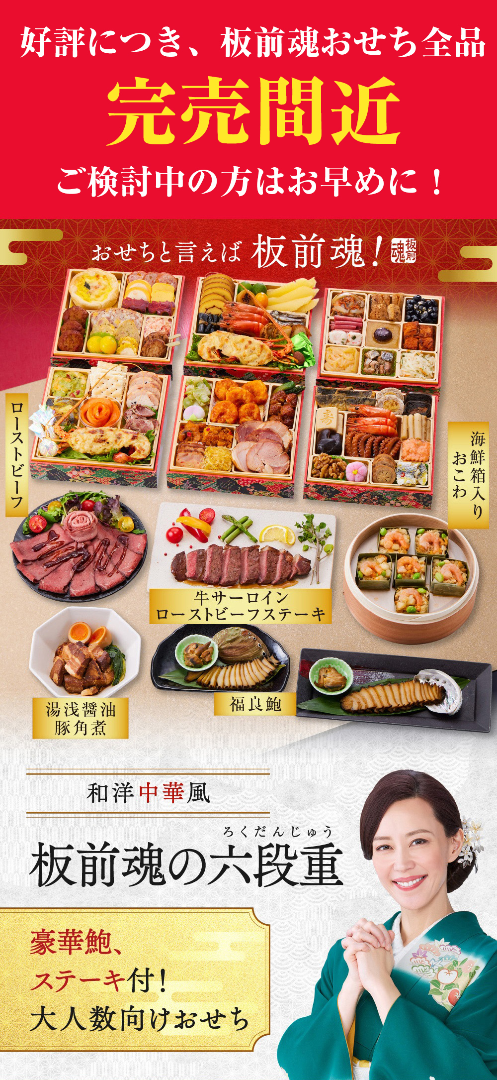 板前魂のおせち料理は、函館、小樽 、仙台、 築地 、山梨、金沢、浜松、 京都 、下関、 博多 、鹿児島など日本や海外の産地をまわり厳選した食材を使用し、有名店やホテルで修行したシェフや繁盛店を営む板長といった4人の匠が監修しています。
