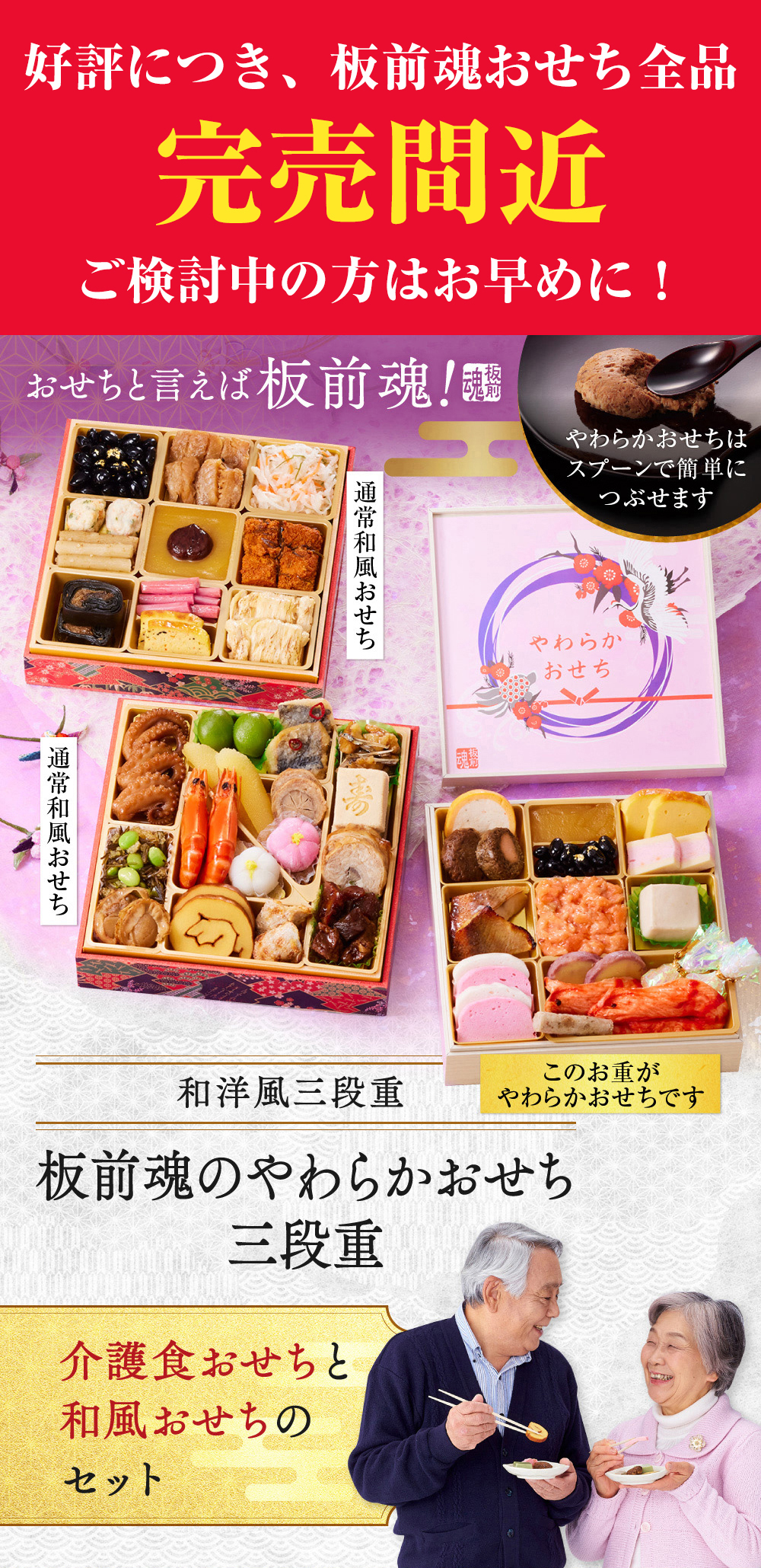 板前魂のおせち料理は、函館、小樽 、仙台、 築地 、山梨、金沢、浜松、 京都 、下関、 博多 、鹿児島など日本や海外の産地をまわり厳選した食材を使用し、有名店やホテルで修行したシェフや繁盛店を営む板長といった4人の匠が監修しています。