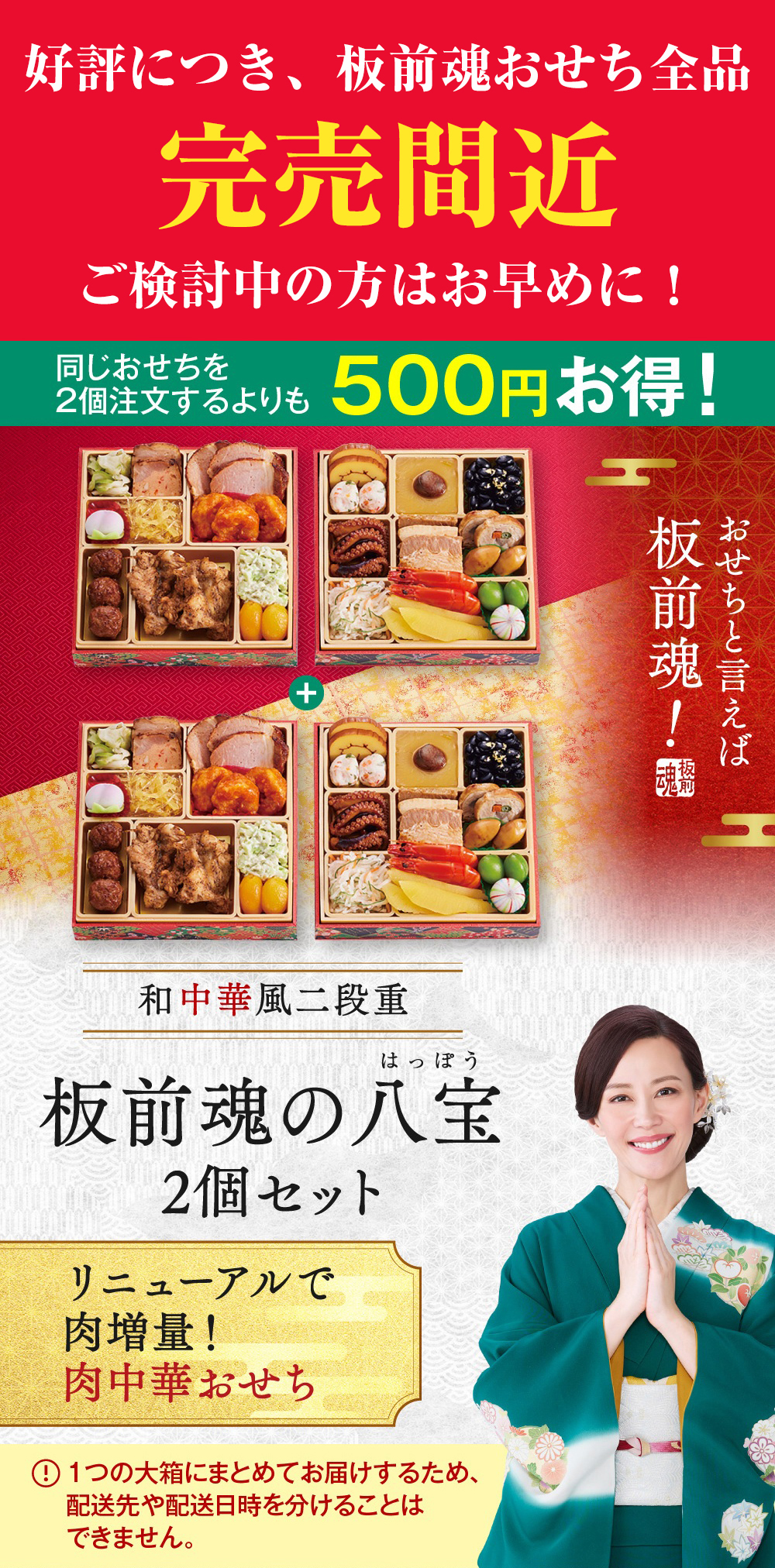 板前魂のおせち料理は、函館、小樽 、仙台、 築地 、山梨、金沢、浜松、 京都 、下関、 博多 、鹿児島など日本や海外の産地をまわり厳選した食材を使用し、有名店やホテルで修行したシェフや繁盛店を営む板長といった4人の匠が監修しています。