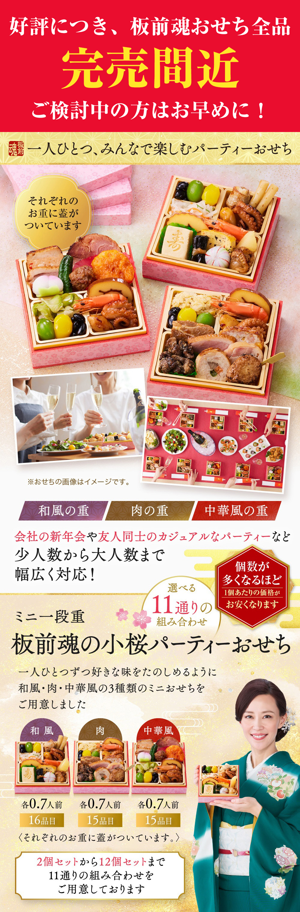 板前魂のおせち料理は、函館、小樽 、仙台、 築地 、山梨、金沢、浜松、 京都 、下関、 博多 、鹿児島など日本や海外の産地をまわり厳選した食材を使用し、有名店やホテルで修行したシェフや繁盛店を営む板長といった4人の匠が監修しています。