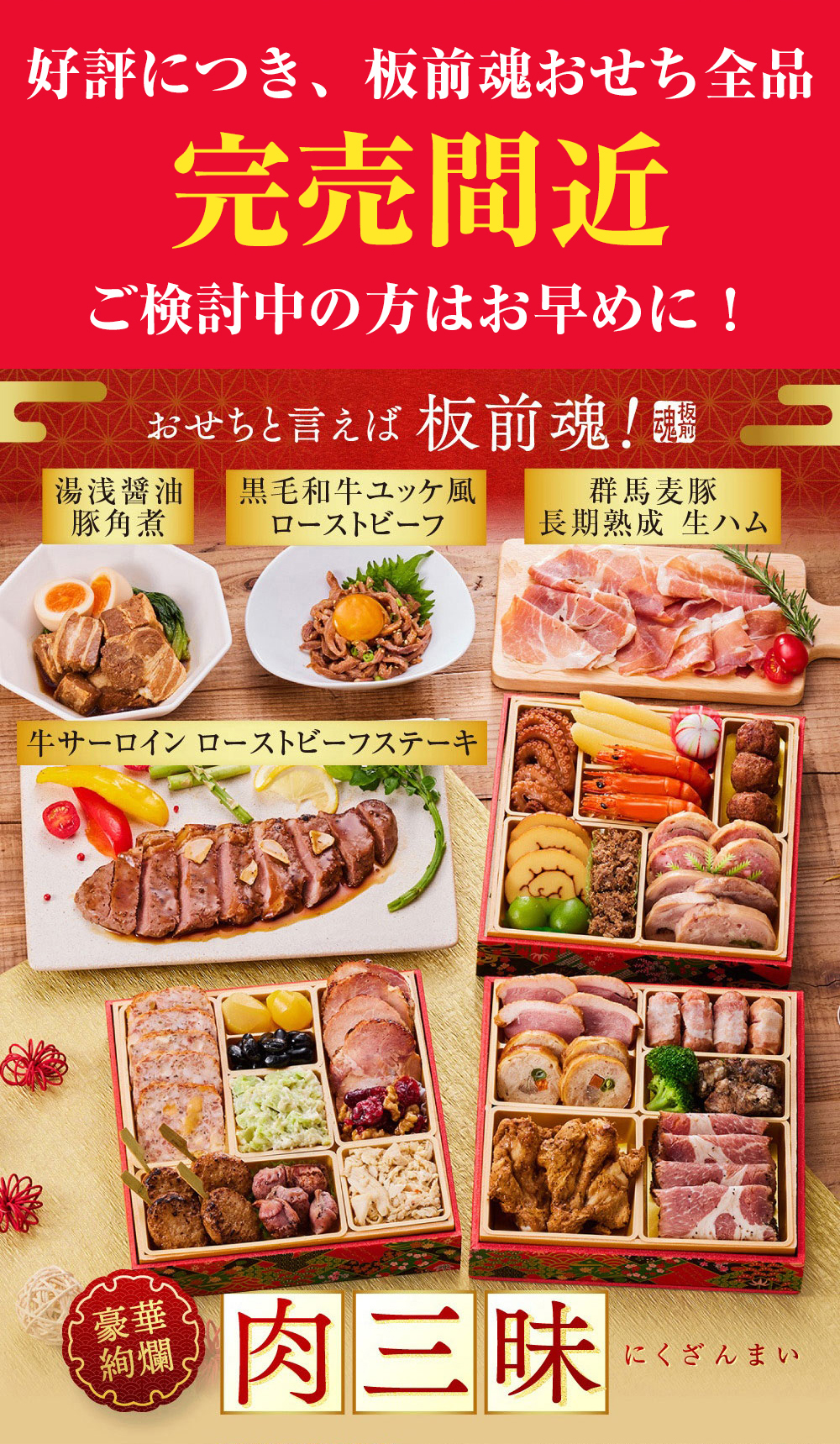 板前魂のおせち料理は、函館、小樽 、仙台、 築地 、山梨、金沢、浜松、 京都 、下関、 博多 、鹿児島など日本や海外の産地をまわり厳選した食材を使用し、有名店やホテルで修行したシェフや繁盛店を営む板長といった4人の匠が監修しています。