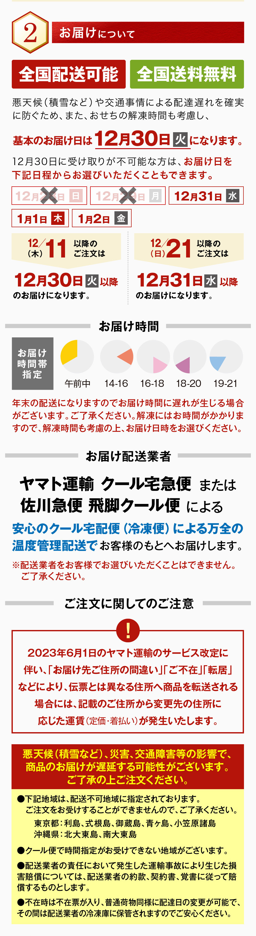 悪天候(積雪など)や交通事情による配達遅れを確実に防ぐため、また、おせちの解凍時間も考慮し、基本のお届け日は12月30日(火)になります。