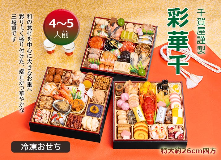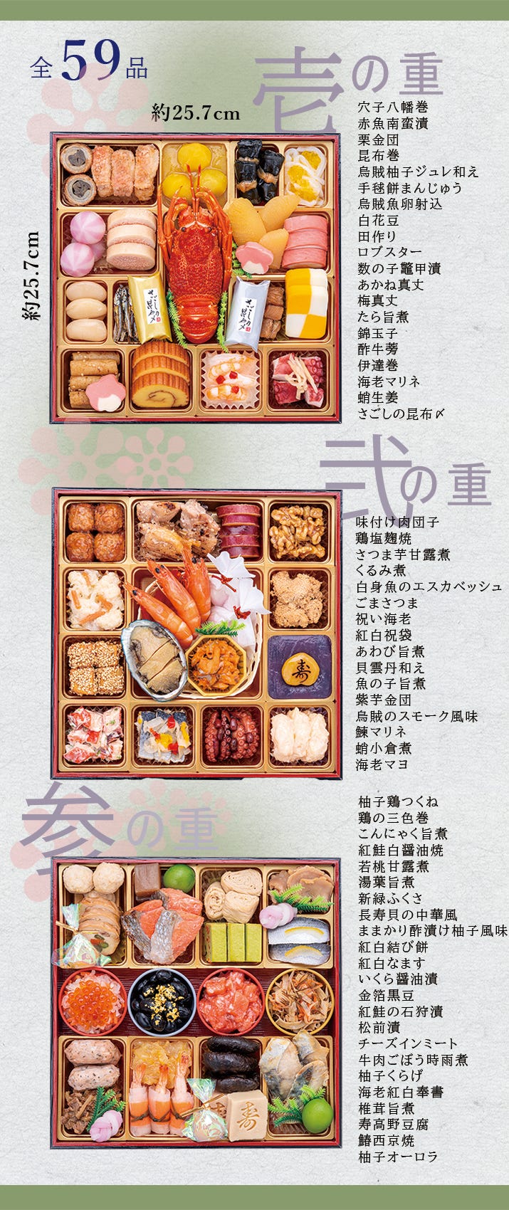和の食材を中心に大きなお重へ彩りよく盛り付けた、端正かつ華やかな三段重です