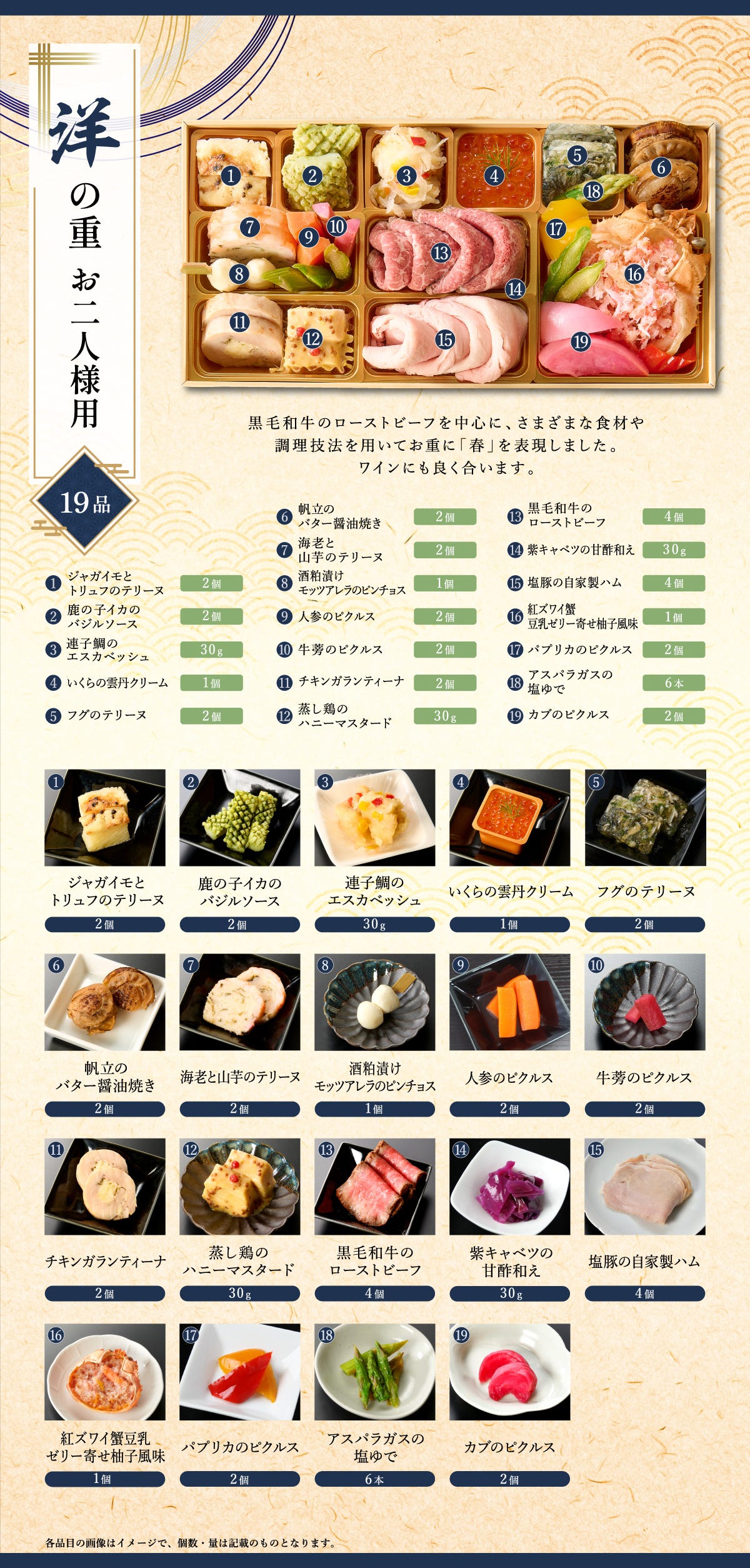 おひとり一重づつお召し上がりいただける「和」の重が二客、夕食やお酒のお供に お召し上がりいただける洋風オードブルの組み合わせとなっております。料理人が「ぜひ食べて欲しい」をかたちにした特選おせちです。
