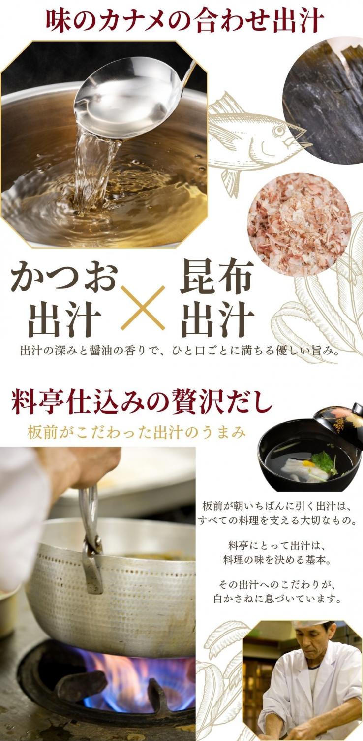 原材料:精米(新潟県長岡産コシヒカリ)、出汁(かつお節、昆布)、醤油、酒、塩/アルコール、調味料(アミオ酸等)、甘味料(甘草) 一部に小麦・大豆を含む
