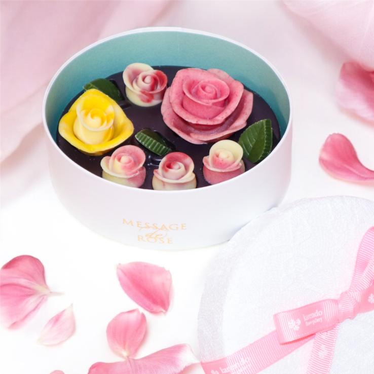 箱を開けると、チューリップのようにふんわり優しい色合いの薔薇のショコラが咲きこぼれ、上品な甘い香りがふわりと広がります。