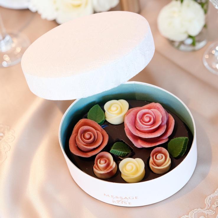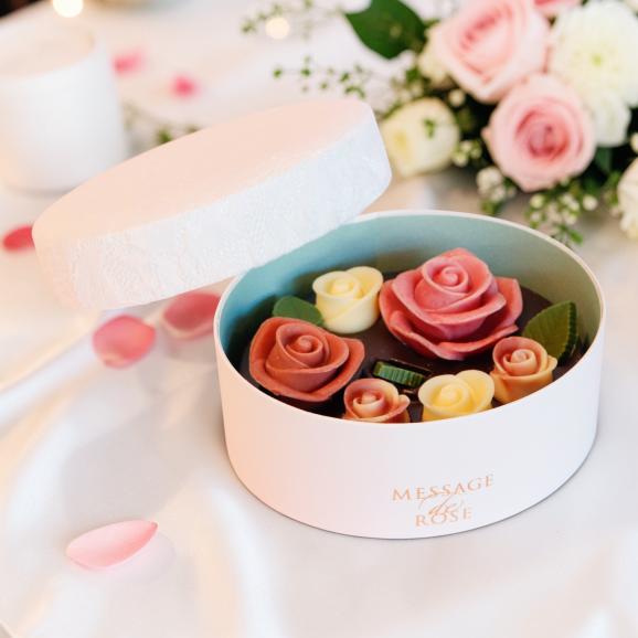 箱を開けると、アネモネを思わせるやさしく可憐な色合いの薔薇のチョコレートが、宝石のように美しく並び、上品な甘い香りがふんわりと広がります。まるで本物の花をそっと詰め込んだような、美しさとときめきに満ちたひと箱です。