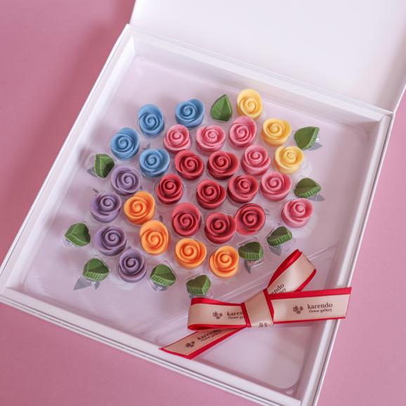 7⾊のバラのチョコレートを花束⾵に⾒⽴てたカラフルなチョコレート。