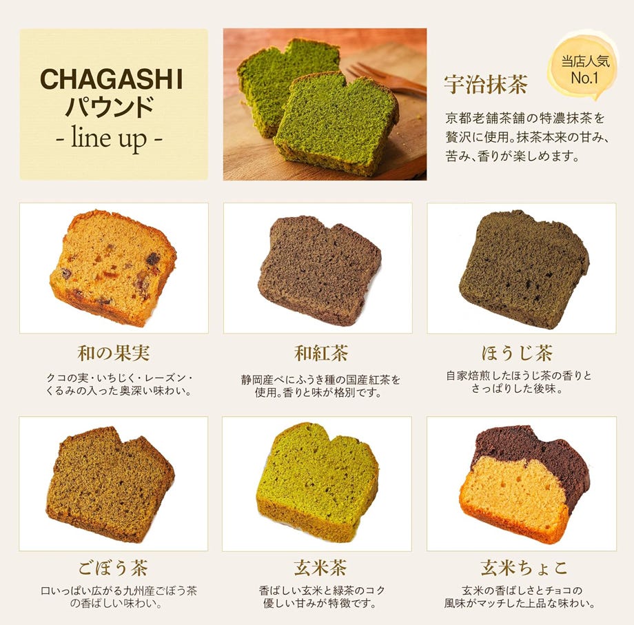 宇治抹茶、和の果実、ほうじ茶、玄米茶、ごぼう茶、和紅茶、玄米ちょこ