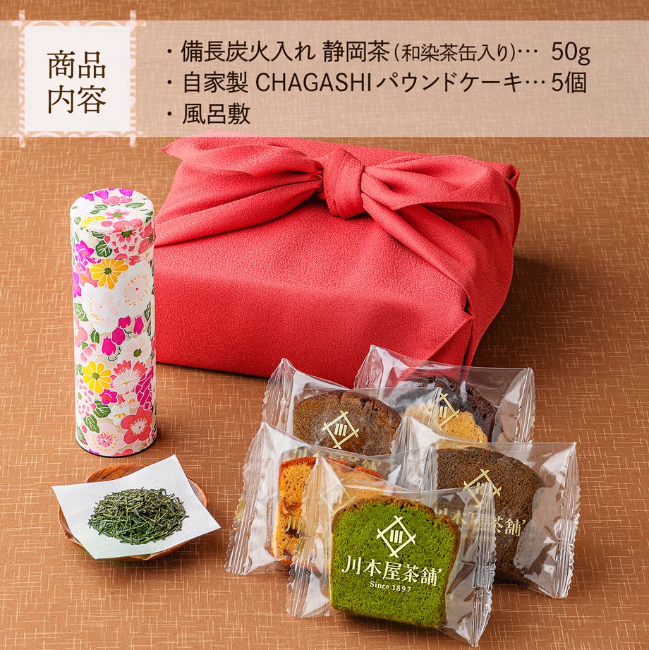 - パウンドケーキ 5個、備長炭火入れ静岡茶 50g